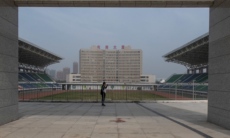 Điện tử ở thành phố Nizhou Trong trung tâm thương mại, công trình 4 tòa nhà đang xây dựng dường như bị hoãn lại, tòa nhà đang xây dở dang là khẩu hiệu bạt đỏ “Chung tay bốn phương, cùng nhau viết tiếp giấc mơ Trung Hoa”